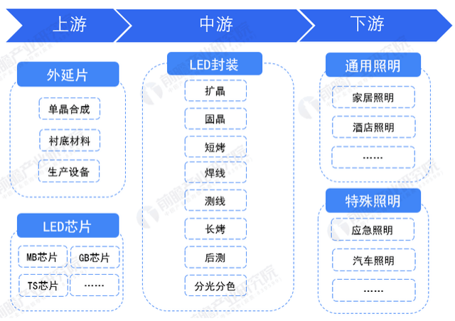 LED照明行業(yè)由上游的外延片及LED芯片廠商、中游的LED封裝以及下游照明應(yīng)用領(lǐng)域組成。上游的外延片及LED芯片 ,主要提供LED封裝環(huán)節(jié)的原材料;中游LED封裝主要是通過擴(kuò)晶、固晶、短烤、焊線等一系列流程完成LED產(chǎn)品的制造;下游應(yīng)用則分為通用照明及特殊照明兩大類,通用照明包括家居照明、酒店照明等;特殊照明則包括應(yīng)急照明、汽車照明等。
