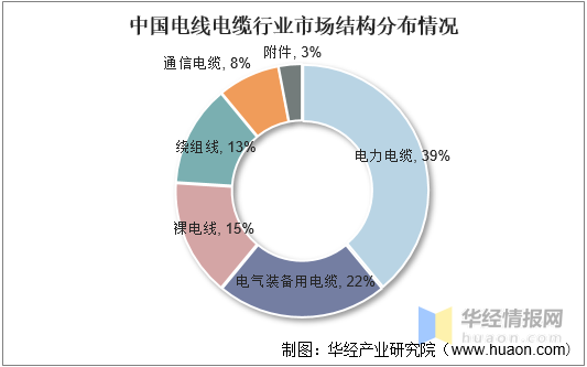 從我國電線電纜市場結(jié)構(gòu)來看,目前,電力電纜是行業(yè)市場占比最大的細分領(lǐng)域,占比達39%,其次為電器裝備用電纜和裸電線,占比分別為22%和15%。