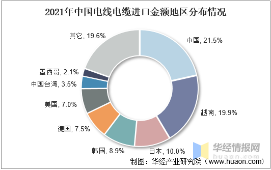 從進口分布情況來看,2021年我國電線電纜進口金額中,占比前三的地區(qū)分別為中國、越南和日本,占比分別為21.5%、19.9%和10%。