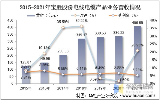 寶勝科技創(chuàng)新股份有限公司(簡稱寶勝股份)是中國航空工業(yè)集團公司旗下的上市公司,公司主要從事電線電纜及電纜附件開發(fā)、制造、銷售及相關(guān)的生產(chǎn)技術(shù)開發(fā)。公司產(chǎn)品覆蓋裸導體、電氣裝備用電纜、電力電纜、通信電纜及光纜等,是我國電線電纜行業(yè)主要龍頭企業(yè)之一。據(jù)資料顯示,2021年寶勝股份電線電纜產(chǎn)品業(yè)務(wù)營收為406.59億元,同比增長20.93%,毛利率為5.23%。