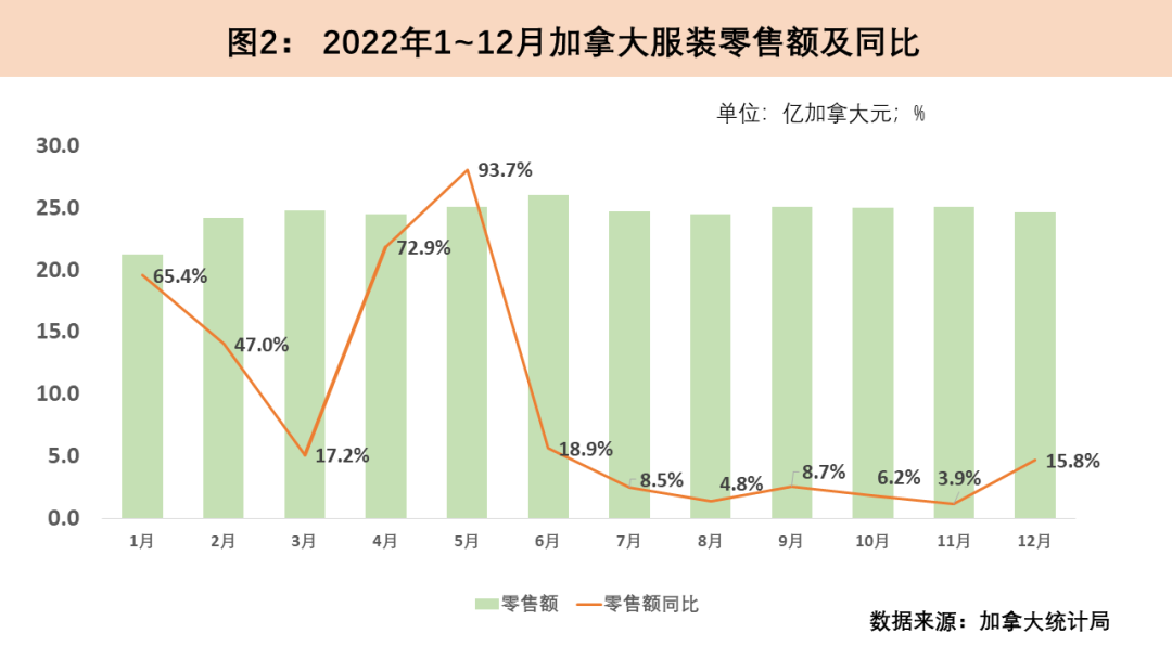 2022年加拿大同樣飽受高通脹的困擾,年度平均通脹率達(dá)6.8%,較上年翻了一番,但整體好于美國。2022年1至5月加拿大服裝零售在上一年低基數(shù)效應(yīng)的影響下大幅增長,5月服裝零售額同比增幅達(dá)93.7%。隨著2022年6月加拿大通脹率攀升至8.1%的最高點(diǎn),同時低基數(shù)效應(yīng)減弱,加拿大服裝零售在下半年增速驟降至個位數(shù)。2022年12月,加拿大服裝零售迎來一波小回升,當(dāng)月服裝零售額達(dá)24.7億加元(約18.1億美元),同比增長15.8%。