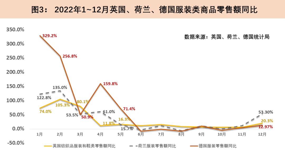 2022年荷蘭服裝零售基本遵循同年英國的變動軌跡。在前四個月服裝零售平均同比增速達(dá)到93.1%后,荷蘭服裝零售增速驟減,甚至在6月和8月陷入負(fù)增長;12月則同比大漲53.3%,全年服裝零售累計(jì)增長24%。2022年德國前五個月服裝零售的平均增速在上年低基數(shù)效應(yīng)的影響下同比大漲173.6%,隨后在德國通脹一路走高的背景下逐漸下行,2022全年德國服裝零售同比增長30.7%。