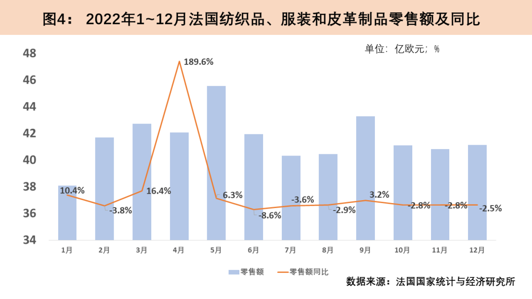 法國GDP在2020年經(jīng)歷急劇下滑后,于2021年第三季度在政府經(jīng)濟(jì)刺激舉措的作用下實(shí)現(xiàn)了顯著反彈,恢復(fù)至疫情前水平。2022年下半年以來,法國家庭消費(fèi)受通脹抑制,經(jīng)濟(jì)增長呈下降態(tài)勢,2022年全年經(jīng)濟(jì)增速僅為2.6%。2022年法國紡織品服裝類商品零售在經(jīng)歷了4月的一波高速增長后下半年同比增速持續(xù)為負(fù),全年紡織品、服裝和皮革制品零售額達(dá)492.5億歐元(約529.8億美元),同比增長4.5%。