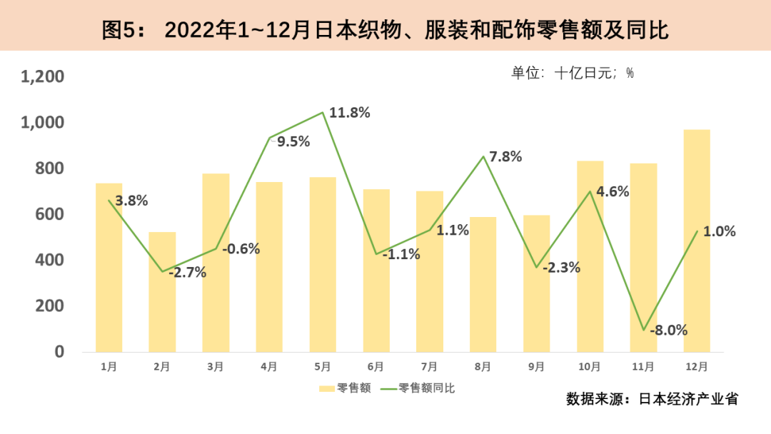 2022年日本紡織品服裝零售額受疫情反復(fù)而波動。2022年初日本受到奧密克戎病毒的沖擊,2月紡織品服裝零售環(huán)比驟降29.3%,同比下滑2.7%。2022年3月日本全面解除疫情管控措施,紡織品服裝零售額于4月增速由負(fù)轉(zhuǎn)正,5月同比增速達(dá)11.8%。2022年7至9月日本迎來第二輪疫情高峰,7月以來日本紡織品服裝零售額連續(xù)三月下降。10月,日本解除入境限制并對國內(nèi)旅游發(fā)放補(bǔ)貼,經(jīng)濟(jì)刺激政策下服裝消費(fèi)開始穩(wěn)步回升,12月日本紡織品服裝零售額環(huán)比上漲18.5%。