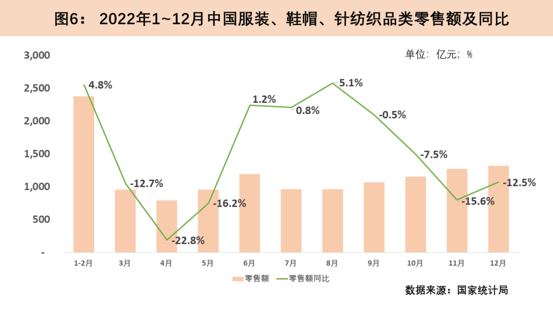 2022年,我國經(jīng)歷多輪疫情反復(fù)沖擊,尤其是3月和11月兩波疫情的大面積反撲導(dǎo)致我國紡織品服裝零售內(nèi)需承壓,內(nèi)銷市場明顯下滑,全年紡織品服裝零售額呈現(xiàn)波動下行趨勢。2022年3月國內(nèi)疫情呈現(xiàn)多點(diǎn)散發(fā),紡織品服裝產(chǎn)品銷售場景受限,3至5月零售下降明顯。隨著疫情得到有效控制,6至8月紡織品服裝零售同比增速由負(fù)轉(zhuǎn)正。11月疫情形勢再度嚴(yán)峻,我國紡織品服裝零售額快速下降,最高降幅在當(dāng)月達(dá)到15.6%。根據(jù)統(tǒng)計(jì)局?jǐn)?shù)據(jù),2022年全國限額以上服裝、鞋帽、針紡織品類商品零售額共計(jì)13003億元人民幣,同比減少6.5%。